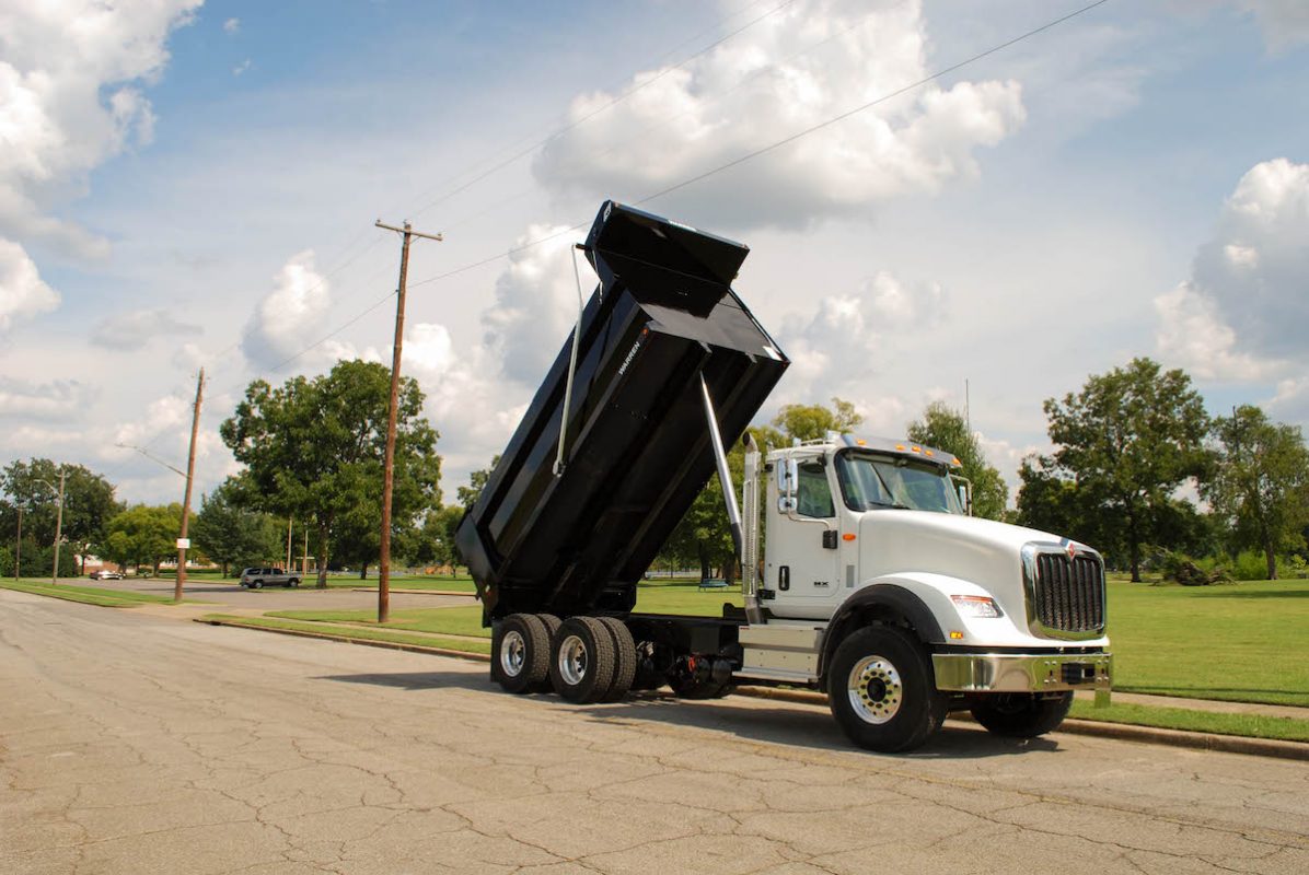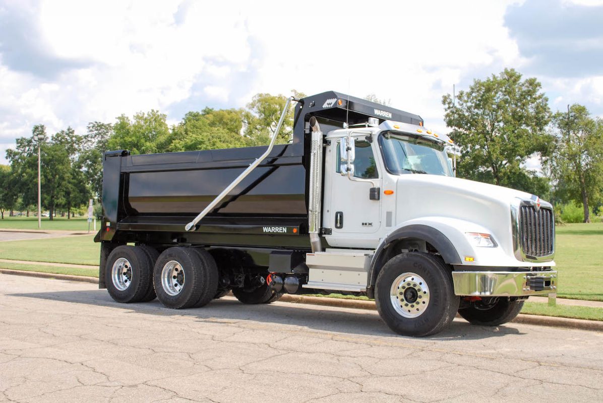 This month’s dump body of the month is a WAR-16 AR-450 steel WAR series dump body. Manufactured by Warren, Inc. in Collins, MS, the Warren WAR series of dump bodies are capable of hauling most anything! So, if you need a dump body that will haul rip-rap or C&D in addition to gravel and/or asphalt then look no further! WAR series dump bodies work for both end users and governmental agencies. This month’s featured WAR series dump body was mounted on an International for a governmental agency in Alabama. The installation was completed by our sister company, Warren Truck & Trailer, Inc., located in Birmingham, AL. This particular dump body is 16′ long with 48″ sides and 56″ bulkhead and tailgate using all 1/4″ AR-450 steel. Thus, it has a capacity of 16/19 cubic yards. In addition, we equipped this truck with an optional bent arm aluminum tarp system as well as steel tubing side boards.